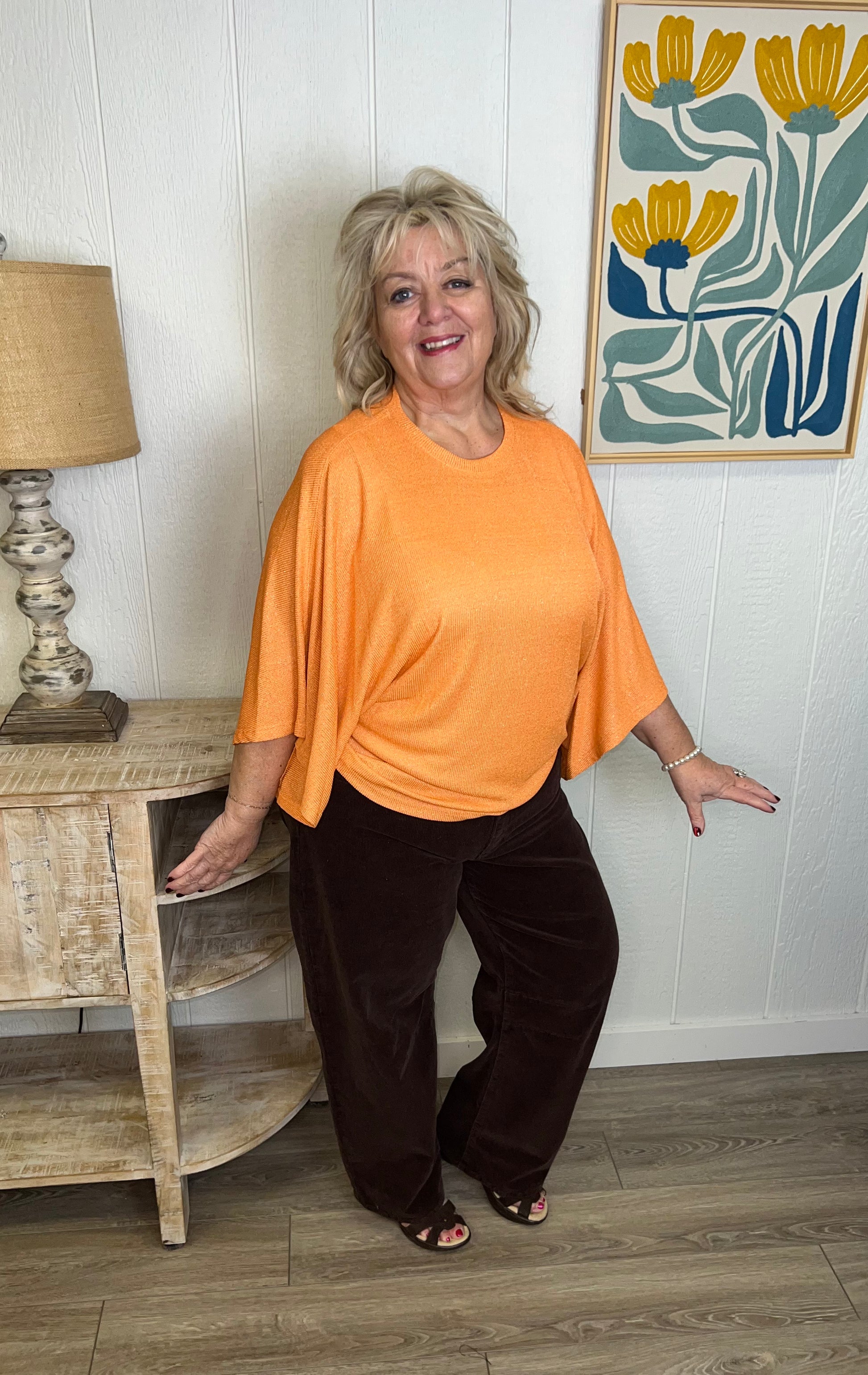 Effortlessly elegant with a hint of sparkle, The Shimmering Grace Cape Top features flowy, wide sleeves and a beautifully draped silhouette that flatters every shape. Subtle shimmer woven throughout adds the perfect touch of glow without overpowering the look. Available in vibrant orange and rich steel blue, it’s a standout piece made for both special moments and elevated everyday style.
